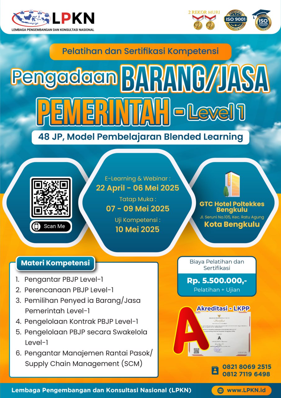 Pelatihan dan Sertifikasi Kompetensi Pengadaan Barang/Jasa Pemerintah Level - 1 (48 JP, Model Pembelajaran Blended Learning)
